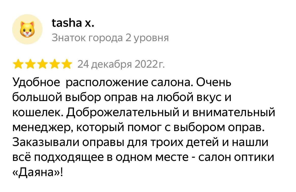 Сеть салонов оптики "Даяна" с радостью стремится предложить каждому клиенту только самое лучшее. В наших уютных салонах вы найдете богатый ассортимент высококачественных медицинских оправ и стильных солнцезащитных очков для всей семьи — от маленьких до взрослых.